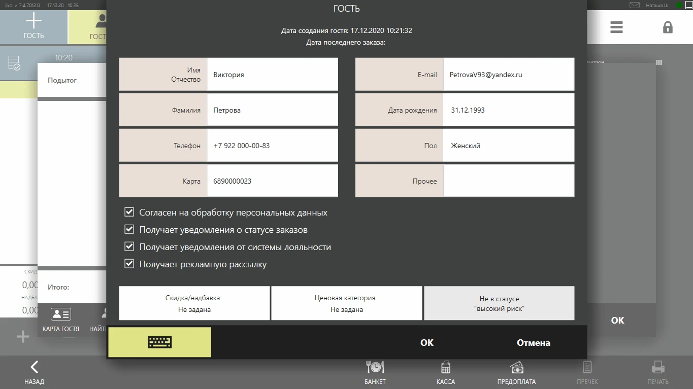 Гость получает электронную карту (iikoWallet), привязанную к номеру телефона. На карту начисляются бонусы, копятся баллы или депозиты, а через мобильные push-уведомления вы можете информировать клиента о новых предложениях.
