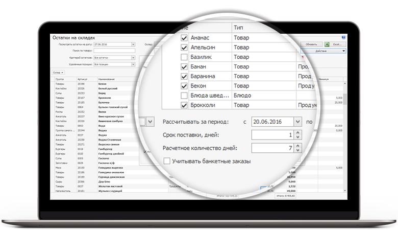 Каждая продажа в iiko приводит к мгновенному списанию нужного количества ингредиентов на складе. Вы видите остатки в режиме реального времени, а программа сразу пересчитывает фудкост.Планирование закупок